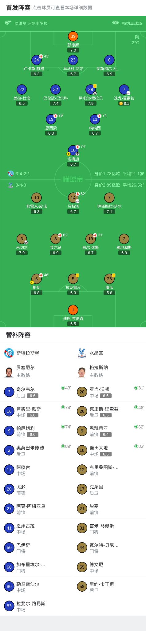 第35分钟,米切尔禁区左路低射破门,水晶宫1-0斯特拉斯堡