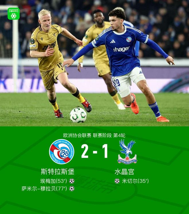 北京时间11月28日,欧洲协会联赛联赛阶段第4轮,斯特拉斯堡迎战水晶宫。比赛中,米切尔接马特塔助攻率先破门,为水晶宫取得领先。随后,埃梅加在迭戈-莫雷拉的助攻下扳平比分。比赛后段,萨米尔-穆拉贝攻入反超一球。最终,斯特拉斯堡以2比1战胜水晶宫。