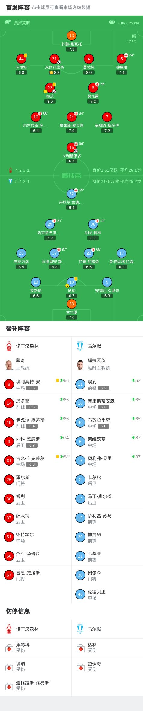 诺丁汉森林3-0马尔默,耶茨、卡利穆恩多、米伦科维奇建功